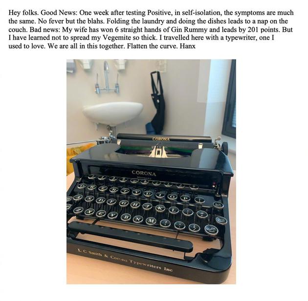 我帶了一臺打字機來這兒(澳洲),本來我很愛它的(打字機是corona牌,跟新冠同名,現在不愛了)。