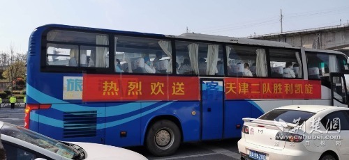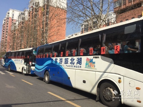 湖北省客集團旅游運輸分公司安排29臺客車,分別從東西湖區、青山區、江岸區接駁天津、 新疆、甘肅、寧夏、山東醫療團隊,約1000名醫護人員前往天河機場乘機返程。