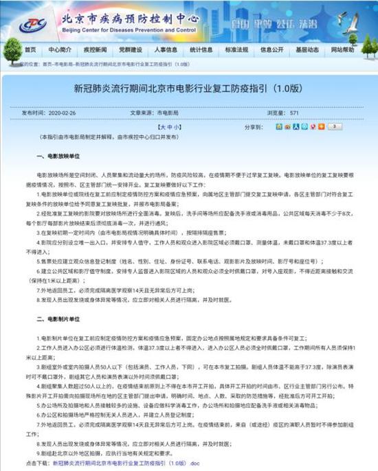 對于電影院復工,北京市電影局也制定《新冠肺炎流行期間北京市電影行業復工防疫指引(1.0版)》,提出如公共區域每天消毒不少于8次、隔排隔座售票、實名制購票等措施。