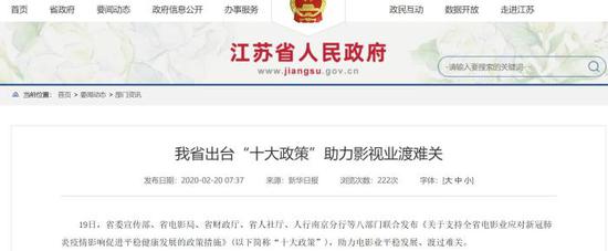 2月19日,江蘇省八部門聯合發布《關于支持全省電影業應對新冠肺炎疫情影響促進平穩健康發展的政策措施》,即“影十條”,從落實稅收優惠政策、加強財政支持力度、加大信貸投放、減免房租等十方面幫助電影業。