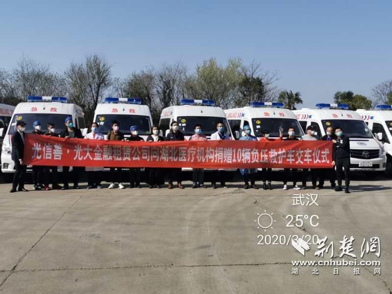 為鞏固抗擊疫情阻擊戰(zhàn)戰(zhàn)果,奪取疫情防控全面勝利,3月20日下午,光大金融租賃股份有限公司(以下簡稱“光大租賃”)向湖北醫(yī)療機(jī)構(gòu)捐贈價(jià)值400萬元的10輛負(fù)壓救護(hù)車交車儀式在湖北武漢舉行。光大租賃、光大銀行武漢分行、光大信托武漢區(qū)域總部相關(guān)負(fù)責(zé)同志,武漢大學(xué)中南醫(yī)院、武漢市中心醫(yī)院等受捐醫(yī)療機(jī)構(gòu)代表參加了此次交車儀式。此次捐贈,光大租賃、光大銀行武漢分行和光大信托三家單位聯(lián)合作戰(zhàn)、爭分奪秒,24小時(shí)內(nèi)就從南京生產(chǎn)廠家將剛下線的救護(hù)車運(yùn)抵武漢。