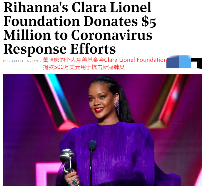 網易娛樂3月22日報道 據外媒報道,當地時間3月21日,美國知名女歌手蕾哈娜(Rihanna)通過個人慈善基金會捐款500萬美元用于抗擊新冠肺炎。