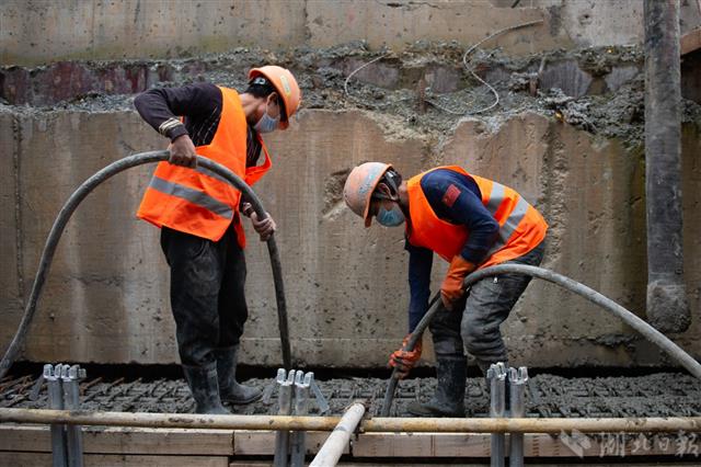 3月22日,武漢軌道交通8號線二期工程街道口站,工人正在澆筑混凝土。