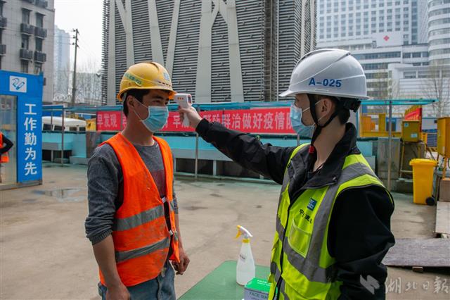 3月22日,武漢軌道交通8號線二期工程街道口站,工作人員測量體溫。