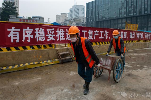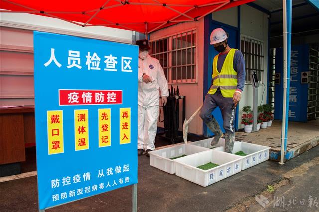 3月22日,武漢軌道交通8號線二期工程街道口站,工人進入工地前,對鞋底進行消毒。當日,因疫情停工了50多天的武漢軌道交通8號線二期工程街道口站正式恢復施工。目前,武漢地鐵集團正按照復工生產各項要求,有序推進復工復產的各項準備工作。(湖北日報全媒記者 蔡俊 攝)