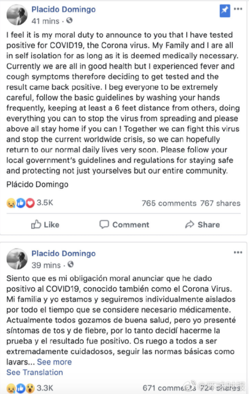 網易娛樂3月23日報道 3月22日晚,被譽為“世界三大男高音之一”的西班牙歌唱家普拉西多·多明戈通過社交媒體宣布,他的新冠病毒檢測呈陽性。目前自己和家人已自我隔離。他此前因為發燒和咳嗽,進行了相關的檢測,結果呈陽性。