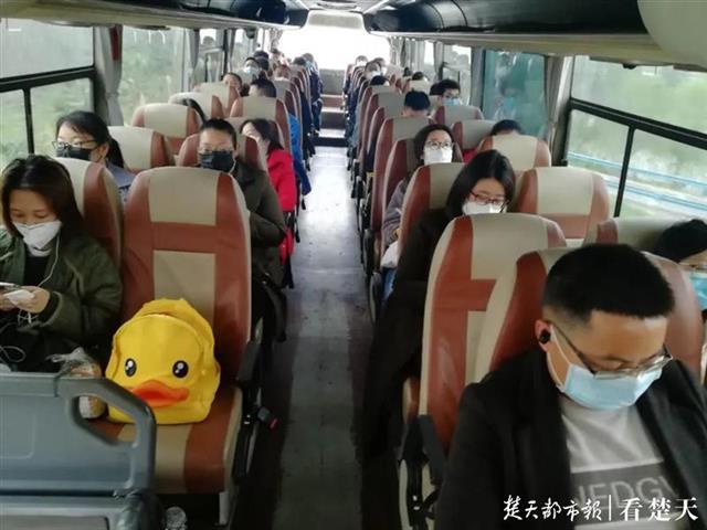 23日中午,他與妻子到達了客運站,找到了專車,經過身份驗證、體溫測量、消毒等程序,夫妻倆成功登上了專車。按照跟車工作人員的指引,大家分開就坐,每排只能坐一個人,他與妻子前后排交叉坐,全程佩戴口罩。“我們這輛專車坐了4個企業的返漢員工,50%的就座率,全車不到30人。工作人員逐一發放了復工證明,車上還配備了礦泉水,很貼心。”鄭海翔說。