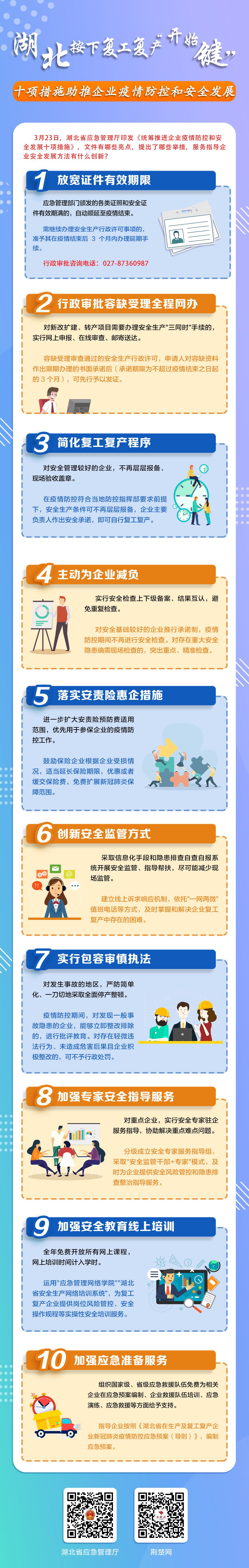 為全面落實省委、省政府和應急管理部有關工作要求,全力支持企業安全發展,奮力奪取疫情防控和經濟社會發展雙勝利。3月24日,湖北省應急管理廳印發《統籌推進企業疫情防控和安全發展十項措施》。