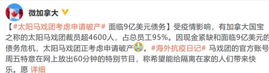 網易娛樂3月30日報道 受疫情影響,有加拿大國寶之稱的太陽馬戲團裁員超4600人,占總員工95%。因現金緊缺和面臨9億美元的債務危機,太陽馬戲團正考慮申請破產。