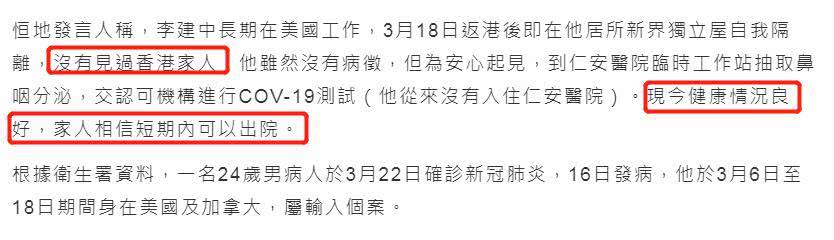 根據媒體的求證,發言人表示:李兆基的外孫李建中一直都在美國工作,直到3月18號才返回香港,之后就一直在他居住的新界獨立屋進行自我隔離,期間并未見過在香港的家人,沒有見過四叔,雖然并沒有病癥,為了安心檢測后被確診。
