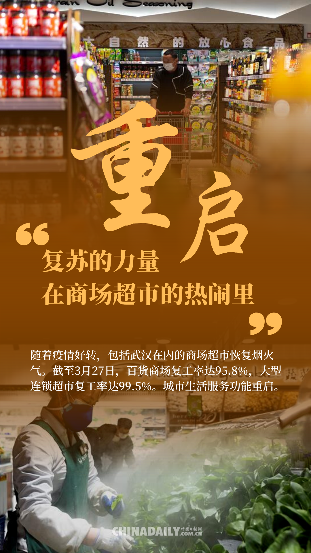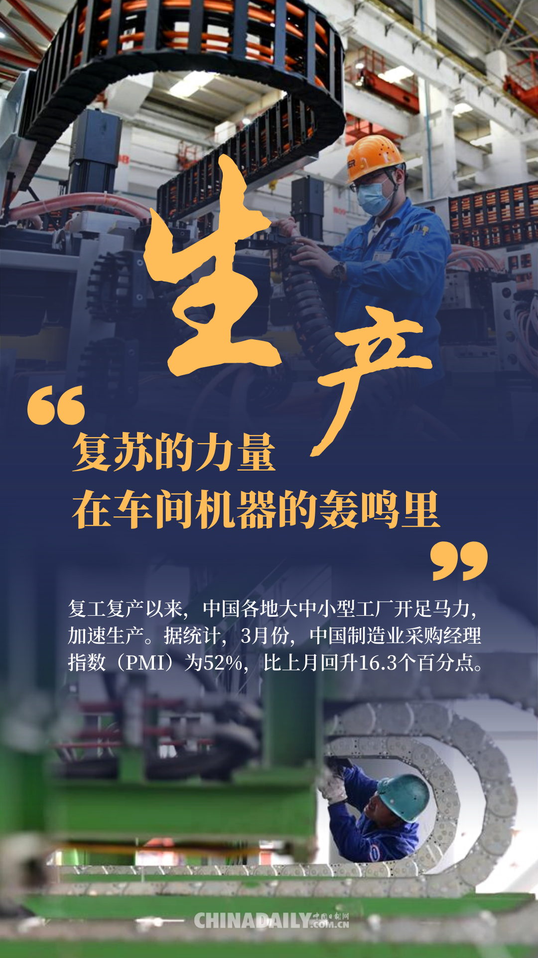 據統計,全國規模以上工業企業開工率達98.6%,中小企業復工率超70%,3月全國制造業采購經理指數比上月回升16.3%,大型超市、百貨商場復功率分別達99.5%和95.8%。