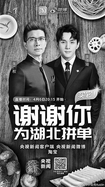 4月6日,央視主持人“段子手”朱廣權與“帶貨一哥”李佳琦組成的“小朱配琦”組合,隔空連線,同框直播,為湖北助力在線賣貨。
