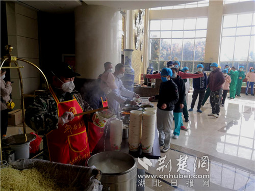 工作組為山西省第四批援鄂醫療隊現場制作熱干面,沖泡蛋酒。通訊員 供圖