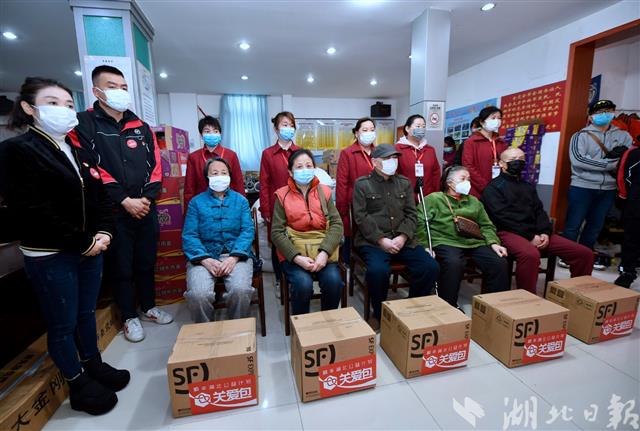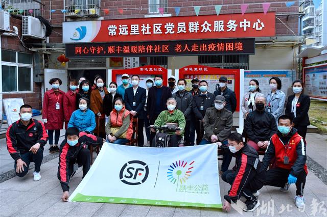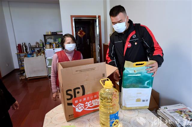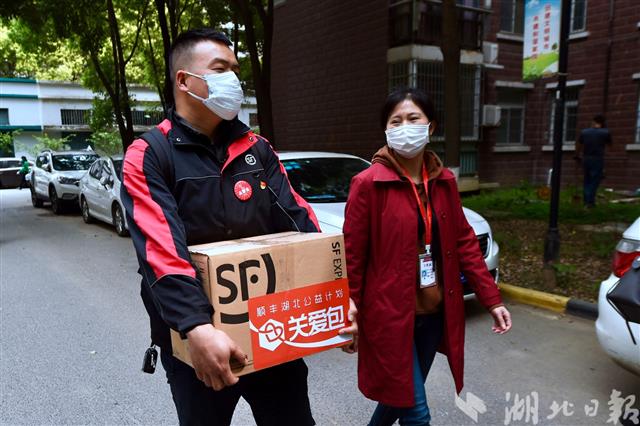 4月10日,由順豐公益基金發起的“同心守護計劃”公益活動在武漢市江漢區漢興街常遠里社區正式啟動。包括“最美快遞員”汪勇在內的3名順豐小哥集體化身”社區管家”,為孤寡獨居、生活困難、行動不便的老人送去包括米、油、家用消毒液、洗手凝膠、口罩等生活必需品在內的“關愛包”。活動當天,首批50個關愛包順利送到老人們家中。順豐公益“同心守護計劃”在武漢以社區為單位,征集、建立社區管家志愿者團隊,計劃為1000名受疫情影響的孤寡獨居、行動不便的老人提供日常家庭生活必需物資保障,關切關懷身心健康。(湖北日報全媒記者 李溪 通訊員 何向軍 攝)