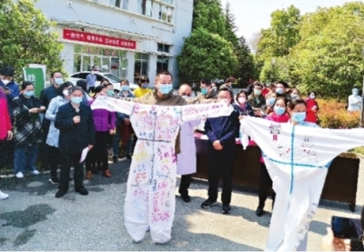 送別儀式上,金銀潭醫院院長張定宇向江蘇醫療隊表達感謝,向他們頒發榮譽職工證書,獻上鮮花。