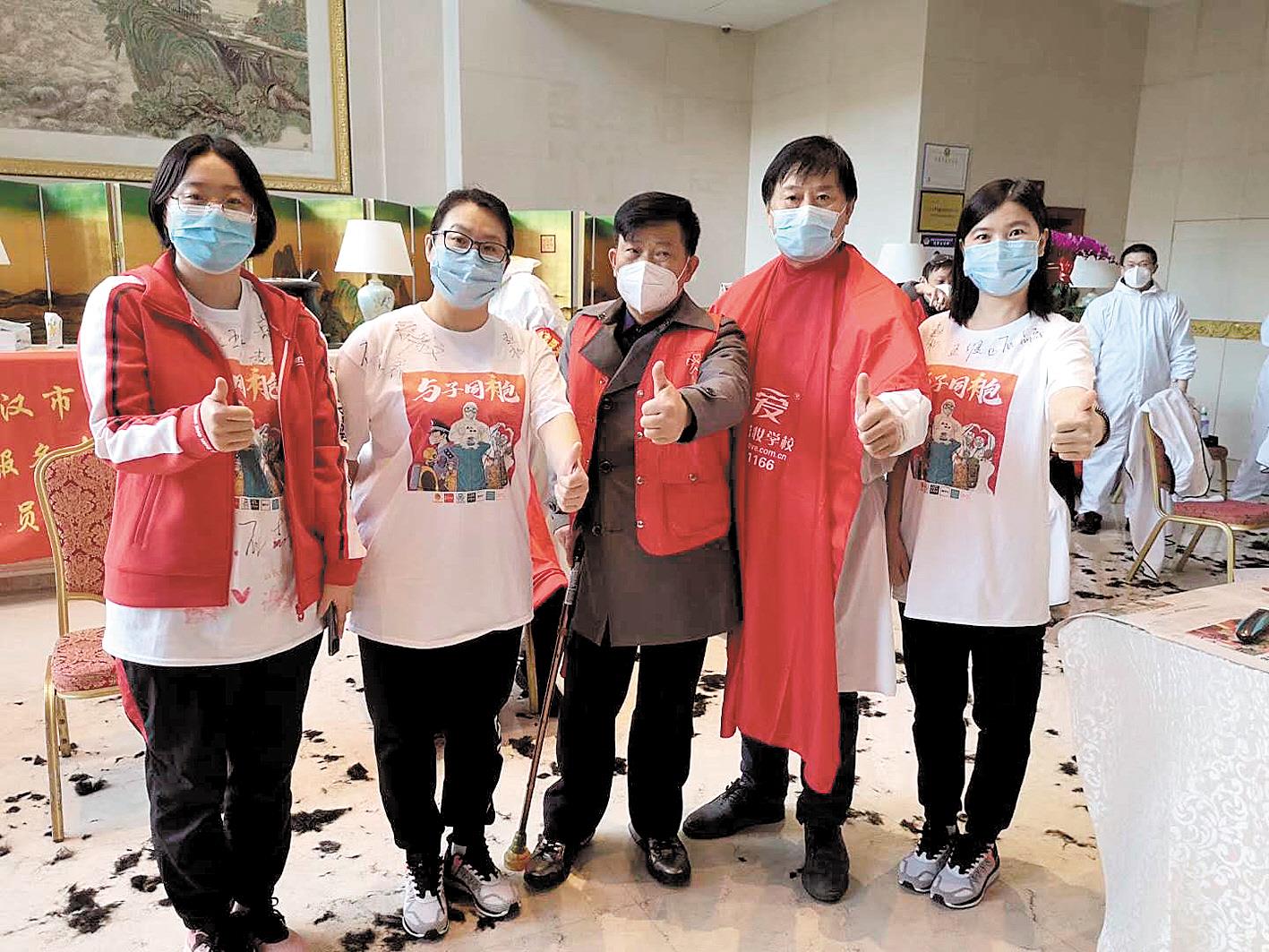 宋忠橋(中)在中南花園酒店為河北援鄂醫(yī)療隊隊員剪發(fā)后合影。 (圖片由受訪者提供)