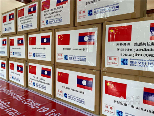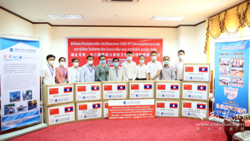 此次捐贈的有一次性醫用口罩、免洗洗手液、額溫槍等防疫物資,總價值35萬元。防疫物資紙箱貼著用中、老兩國語言寫就的“中老友誼 天長地久”“同舟共濟”“老撾加油”等標語。