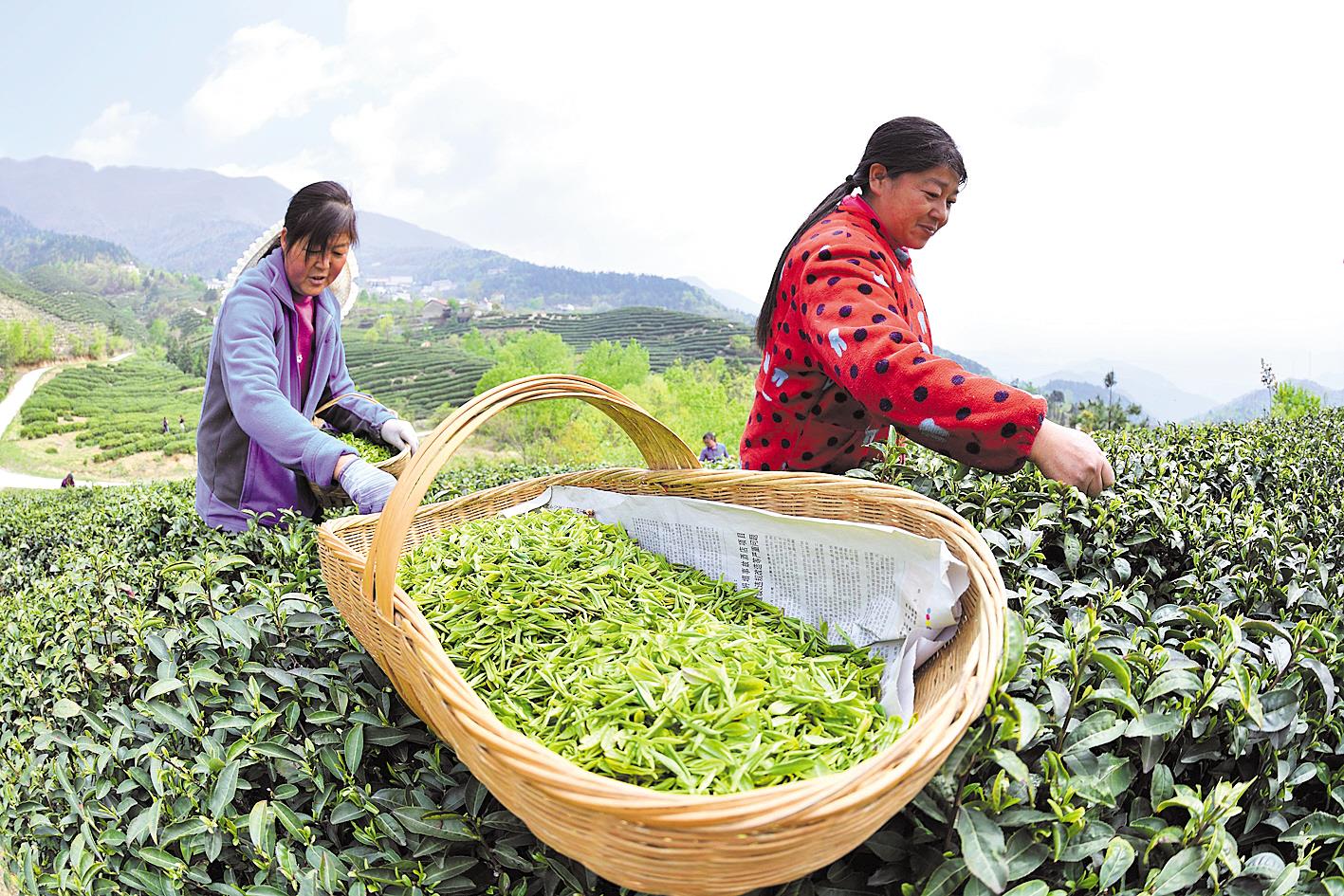 4月6日,茶農在保康縣黃堡鎮大樹埡村生態茶園采摘茶葉。截至2019年底,保康縣茶園面積達15.5萬畝,茶農逾3萬人,年產值6.2億元,茶產業成為山區群眾脫貧致富的支柱產業。 (視界網 楊韜 攝)