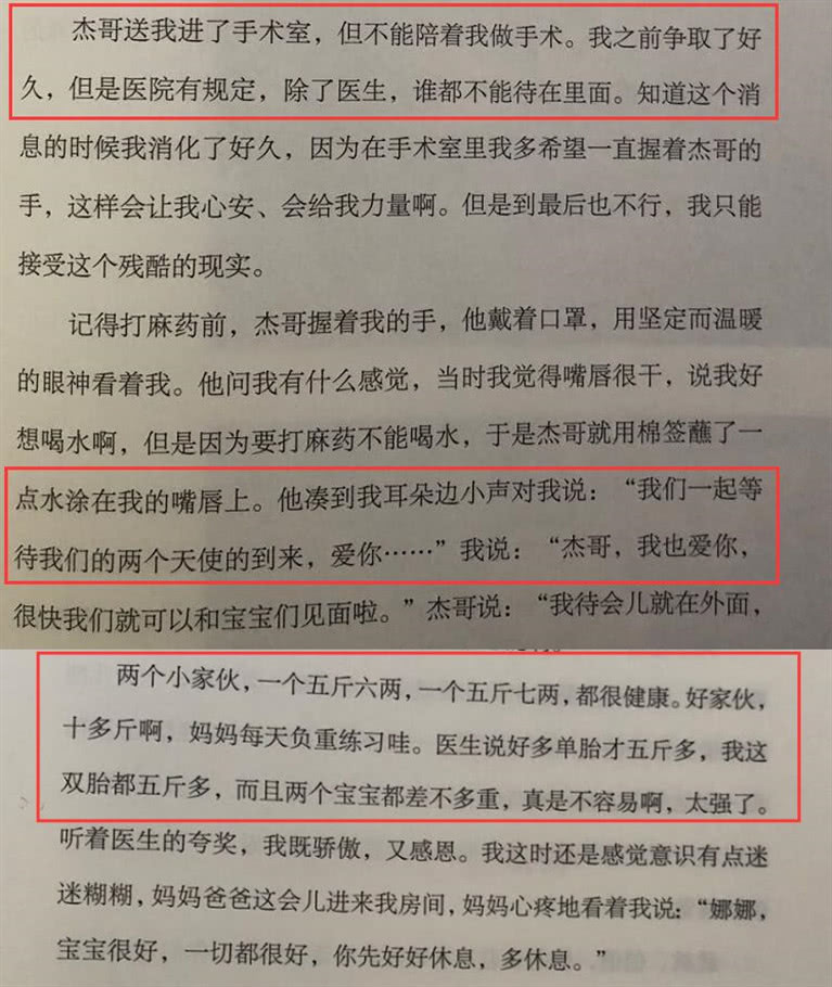 近日,謝娜在新書中記錄了當(dāng)媽媽后的生活點滴,并曬出手術(shù)前一天的溫馨照片。書中她否認(rèn)包一整層產(chǎn)房,稱其只是一個小小的房間。透露為了陪伴謝娜生產(chǎn),何炅特地趕到了上海,住在醫(yī)院附近的酒店。盡管謝娜生產(chǎn)日期有變化,但何老師并不介意,還安慰她說,這么重要的日子,一定會趕來陪她。 在謝娜手術(shù)前,張杰握著她的手鼓勵她表白,還用棉簽蘸了水為她涂抹很干的嘴唇。進手術(shù)室前娜娜雙手比V瞪著眼睛大笑,狀態(tài)超好。 謝娜在書中還描述了自己經(jīng)歷手術(shù)的過程,從打麻藥到醫(yī)生取出孩子,先出來的那個是“跳跳”,所以她是姐姐,“俏俏”則是妹妹。兩個小家伙,一個五斤六兩,一個五斤七兩,醫(yī)生感嘆她很偉大。