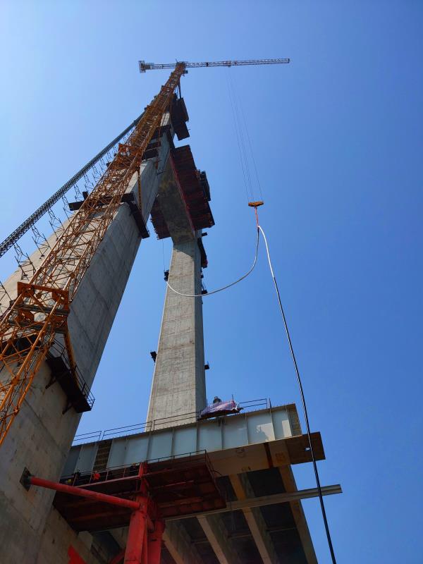 赤壁長江公路大橋主橋斜拉索采用雙塔雙索面布置,全橋共設(shè)116組232根斜拉索。斜拉索采用直徑7mm高強鋅鋁合金鍍層平行鋼絲索,單根最大長度387.21米,最大重量38.49t。本次安裝的首組HB1號索和HZ1號索,長度分別為96.992米和96.492米。首對斜拉索掛設(shè)后,本項目將開始橋面吊機安裝,盡快為連續(xù)規(guī)模安裝鋼主梁和橋面板創(chuàng)造條件。