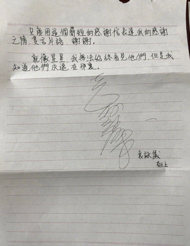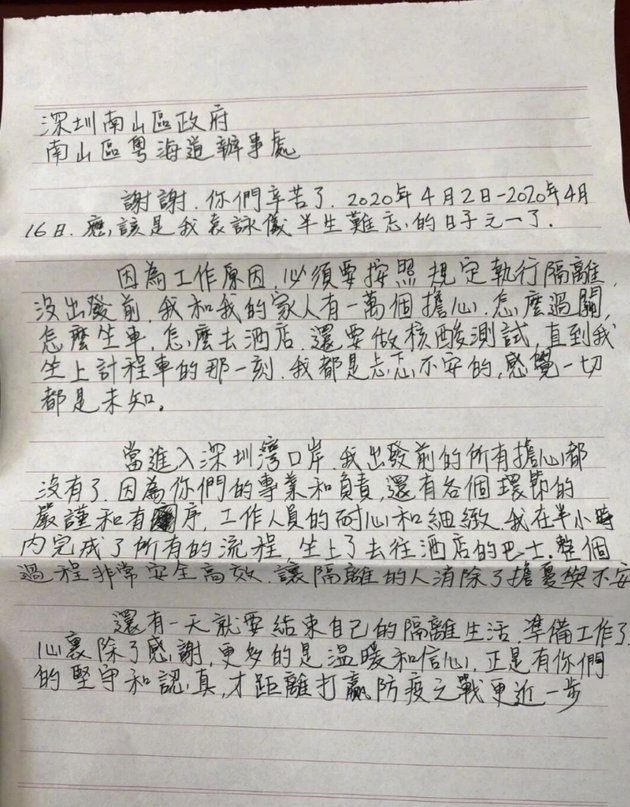 網易娛樂4月19日報道 4月19日,袁詠儀在結束自我隔離前為深圳政府手寫的感謝信曝光。她表示:“由于拍戲需要從香港來內地,出發前,我和家人有一萬個擔心,然而進入深圳灣口岸時,擔心全部一掃而空,工作人員耐心和細致的幫助了我。結束兩周的隔離生活,我除了感謝,更多的是溫暖和信心,感謝一線工作人員的堅守。”她還贊美道:“就像星星,我無法始終看見他們,但是我知道他們永遠在那里”。