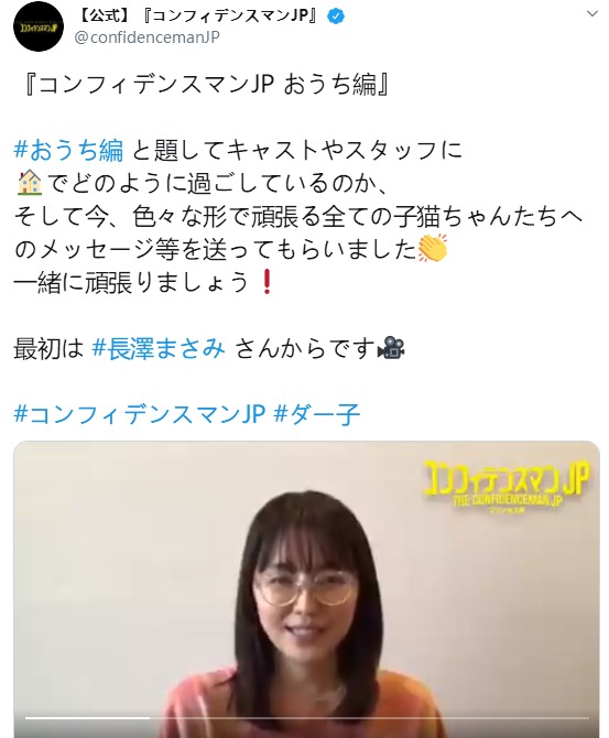 由于疫情影響不能按時(shí)上映,《行騙天下JP公主篇》官方推特就以“行騙天下JP宅家篇”為題,邀請(qǐng)?jiān)撈輪T、制作人員等通過(guò)視頻方式介紹自己的宅家生活,第一位當(dāng)然就是影片主演長(zhǎng)澤雅美。