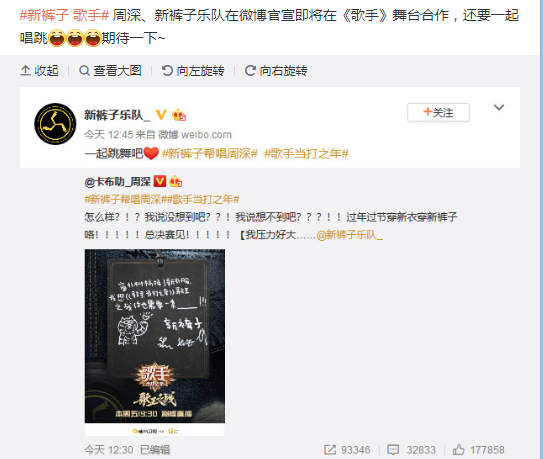 網(wǎng)易娛樂4月21日報道 21日,歌手周深發(fā)文表示新褲子樂隊將成為自己《歌手》總決賽的幫唱嘉賓,他發(fā)文稱:“怎么樣?!?我說沒想到吧??!我說想不到吧???!!過年過節(jié)穿新衣穿新褲子咯!!!總決賽見!”隨后,新褲子樂隊轉(zhuǎn)發(fā)周深微博,表示“一起一起跳舞吧”,疑透露在總決賽上將有唱跳表演。