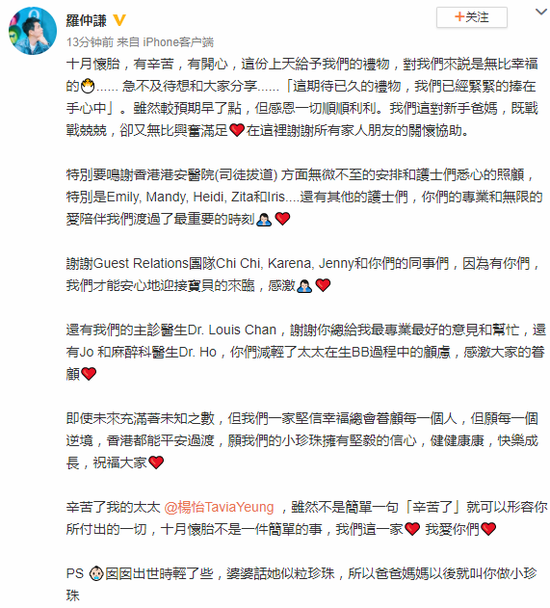 他還在文中感謝了自己的妻子楊怡:“辛苦了我的太太,雖然不是簡(jiǎn)單一句‘辛苦了’就可以形容你所付出的一切,十月懷胎不是一件簡(jiǎn)單的事,我們這一家我愛(ài)你們”。他還在文末透露,因?yàn)榕畠撼錾w重輕了些,所以取小名為小珍珠,頗有寓意。