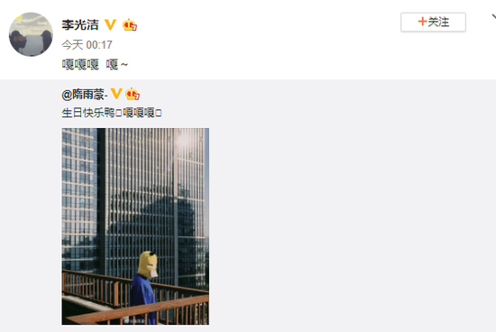 網(wǎng)易娛樂4月23日報(bào)道 4月23日是李光潔的39歲生日。零點(diǎn)剛過,李光潔的妻子隋雨蒙便在微博曬出照片為其慶生,并配文道:“生日快樂鴨,嘎嘎嘎”。隨后,李光潔也轉(zhuǎn)發(fā)微博,并寫道“嘎嘎嘎 ,嘎~”甜蜜又有愛。照片中的人戴著毛線鴨子頭套,身穿藍(lán)色衛(wèi)衣,置身高樓之中,十分有意境。