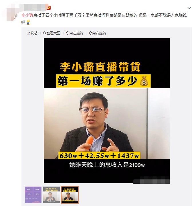直播結束后,數據顯示她4個小時的直播觀看人數高達3789.7萬,訂單量31.4萬,銷售額更是高達4769.6萬。據專業人士分析,李小璐四個小時起碼能獲利2千萬。