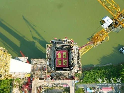 赤壁長江公路大橋北岸主塔成功封頂。(通訊員 供圖)