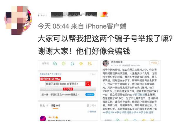 周揚(yáng)青小號(hào)請(qǐng)網(wǎng)友幫忙舉報(bào)騙子微博