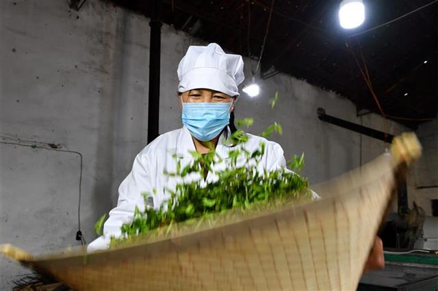 4月25日,在保康縣歇馬鎮百峰村香爐山茶旅莊園,一名茶農在茶葉加工車間篩選茶葉。