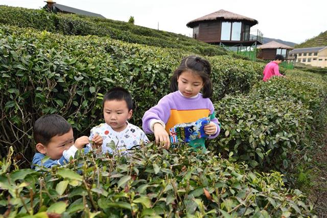 4月25日,幾名小朋友在保康縣歇馬鎮百峰村香爐山茶園體驗采茶。