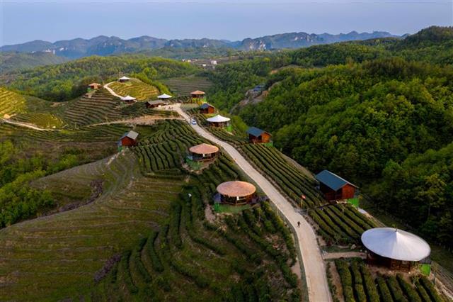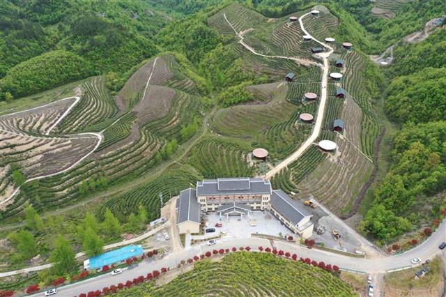 4月25日航拍的保康縣歇馬鎮百峰村香爐山茶園。保康縣歇馬鎮百峰村香爐山茶園面積400畝,緊臨九路寨4A景區,是通往九路寨景區的必經之地。2019年以來,歇馬鎮結合現有茶園布局打造香爐山茶旅融合項目,圍繞茶產業、茶文化、茶旅游的思路,打造集茶園、旅游、民宿等功能為一體的旅游融合示范區,帶動當地貧困群眾增收致富。近年來,保康縣堅持茶園就是景觀的理念,把鄉村旅游與發展茶葉產業相結合,打造百峰香爐山茶旅融合項目等一批鄉村旅游景點,助力鄉村振興,走出一條茶旅融合發展之路。(視界網楊韜攝)