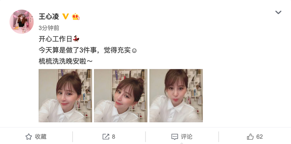 4月27日,王心凌在微博曬出一組美照,并配文:“開(kāi)心工作日,今天算是做了3件事,覺(jué)得充實(shí),梳梳洗洗晚安啦。”照片中,王心凌扎著丸子頭,身穿白色襯衣,對(duì)著鏡頭抿嘴微笑,少女感十足。