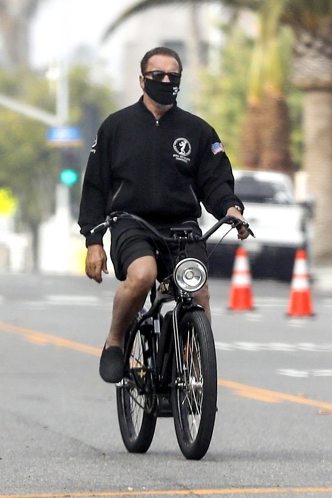 當地時間2020年4月27日,美國布萊特伍德,施瓦辛格(Arnold Schwarzenegger)與朋友現身街頭。施瓦辛格清晨穿黑色外套,搭配短褲不怕冷,單手騎車似魅力青年。