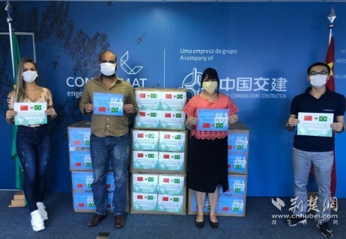 中交二航局捐贈(zèng)的5萬(wàn)只口罩移交巴西康科瑪特公司。通訊員 供圖