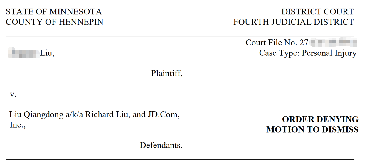 成都商報4月28日報道 紅星新聞記者獲得的美國明尼蘇達法院判決書顯示,當地時間4月27日,法官否決了京東公司要求解除劉某堯針對京東的起訴。此前在1月28日,京東曾遞交了一個動議稱,涉嫌性侵是劉強東的個人行為,要求撇清連帶責任。