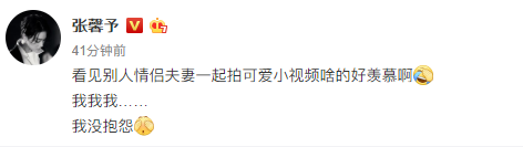 網易娛樂4月30日報道 4月30日,張馨予在微博發文:“看見別人情侶夫妻一起拍可愛小視頻啥的好羨慕啊,我我我……我沒抱怨”,語氣中充滿了對老公的思念之情。網友們紛紛安慰她道:“姐夫工作特殊,等他放假回來拍”“馬上五一了姐夫該回來了”“在線手動艾特那個誰”“等何先生休假了拍一年的量”。
