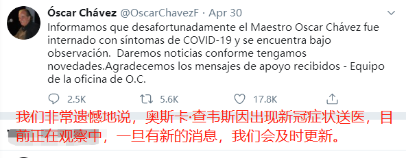 4月30日一早,工作人員在奧斯卡·查韋斯社交賬號上公開奧斯卡·查韋斯出現新冠癥狀:我們非常悲傷地宣布,奧斯卡·查韋斯因出現新冠癥狀送醫,目前正在觀察中,一旦有新的消息,我們會及時更新。