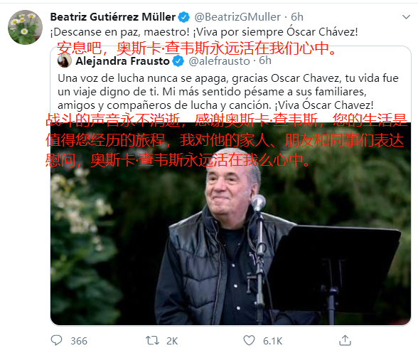 去世消息傳出后,墨西哥文化部長亞歷杭德拉·福斯托(Alejandra Fausto)最先在社交賬號上發文悼念,并對他的家人傳達慰問:“戰斗的聲音永不消逝,感謝奧斯卡·查韋斯,您的生活是值得您經歷的旅程,我對他的家人、朋友和同事們表達慰問,奧斯卡·查韋斯永遠活在我么心中”。隨后,洛佩斯的夫人轉發這則消息并配文:安息吧,你永遠活在我們心中。