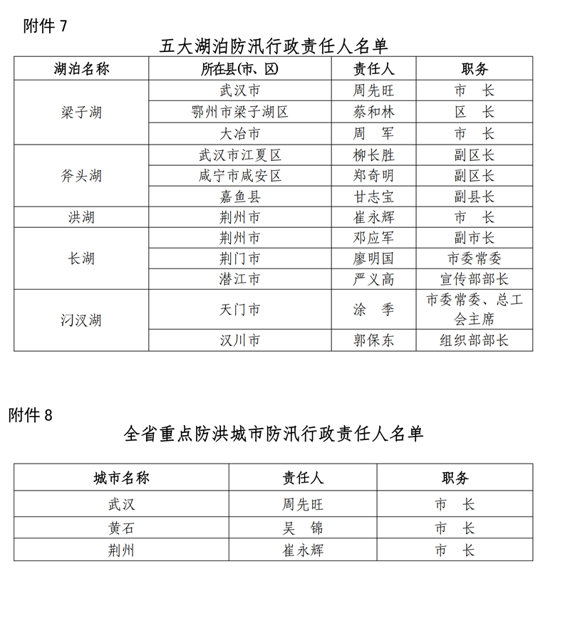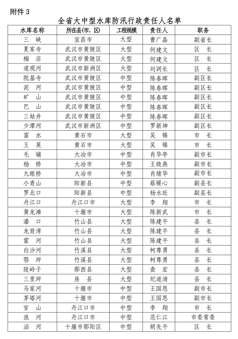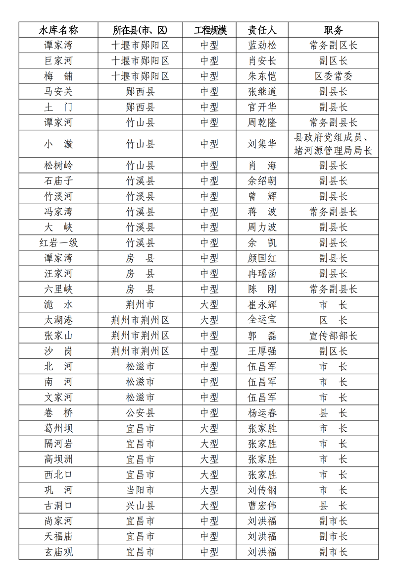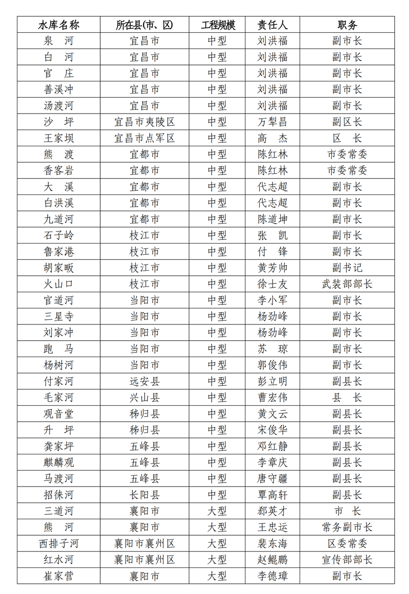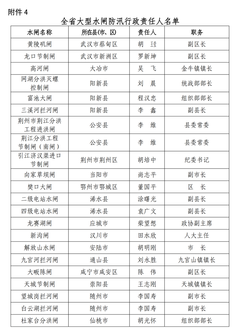 荊楚網客戶端-荊楚網消息(記者張城、通訊員周怡)5月3日,記者從湖北省防汛抗旱指揮部獲悉,為切實做好2020年防汛抗旱工作,根據《中華人民共和國防洪法》《中華人民共和國防汛條例》《中華人民共和國抗旱條例》關于防汛抗旱工作實行各級人民政府行政首長負責制的規定,省防汛抗旱指揮部于近日對外公布了全省防汛抗旱行政責任人,大江大河、大中型水庫、大型水閘、主要蓄滯洪區、大型排澇泵站、五大湖泊及重點防洪城市防汛行政責任人名單,并接受社會各界的監督。