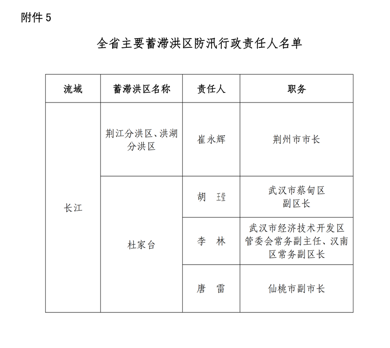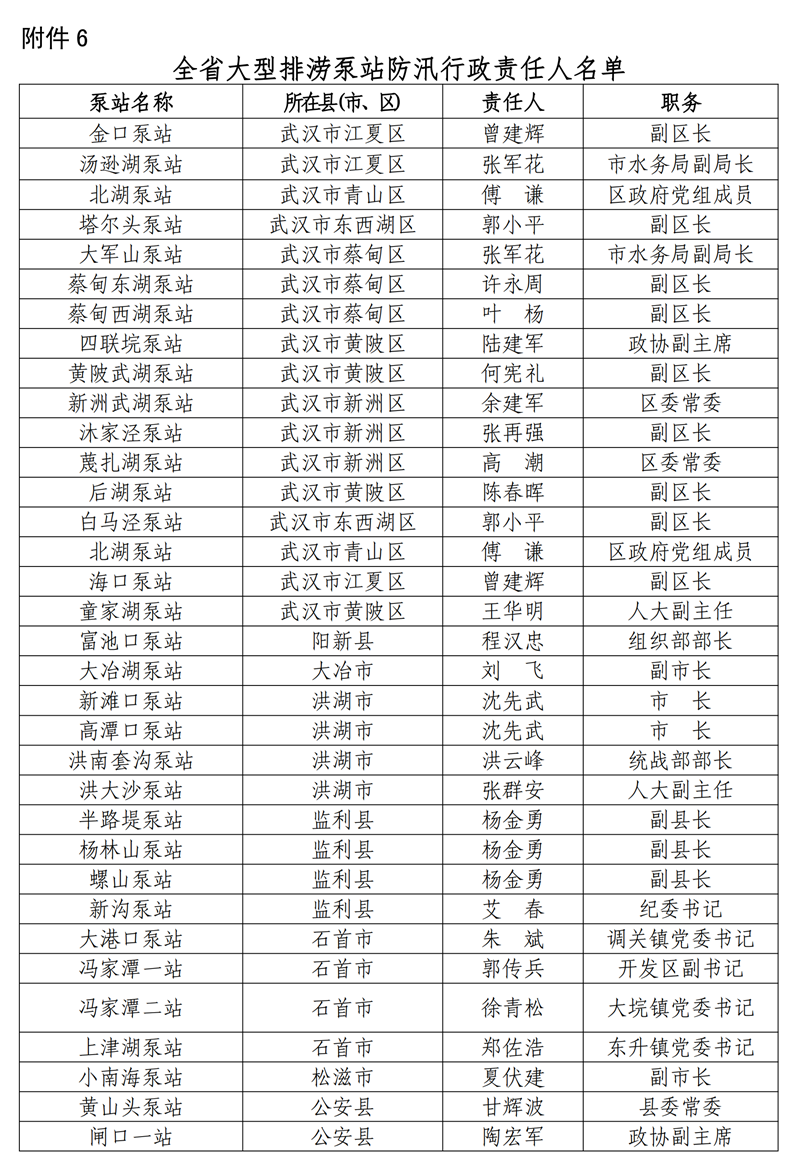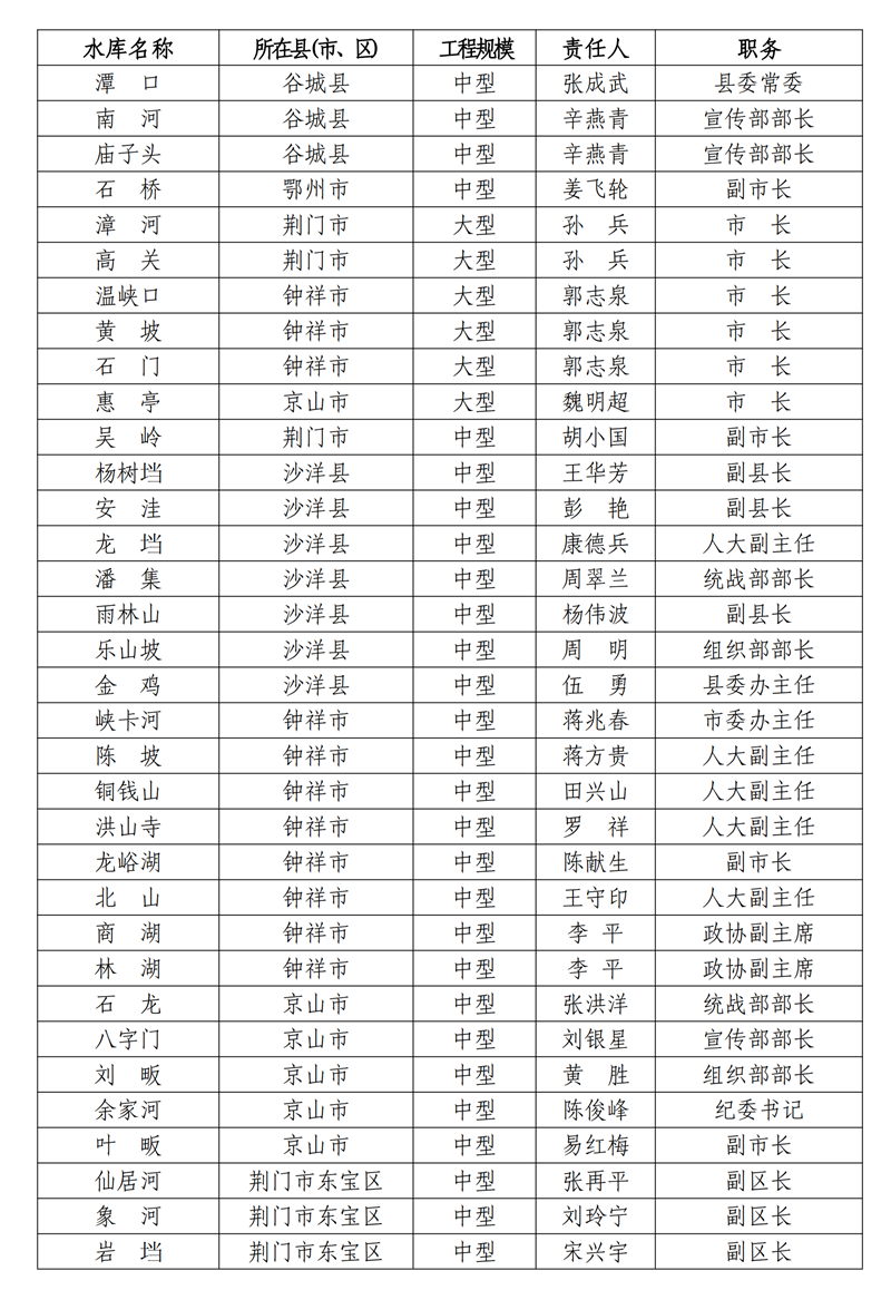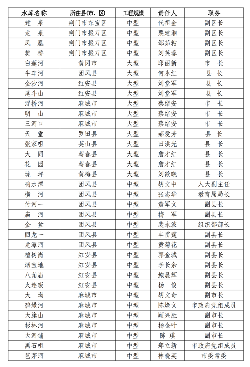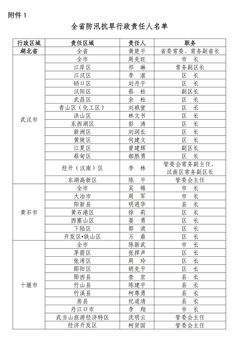 荊楚網客戶端-荊楚網消息(記者張城、通訊員周怡)5月3日,記者從湖北省防汛抗旱指揮部獲悉,為切實做好2020年防汛抗旱工作,根據《中華人民共和國防洪法》《中華人民共和國防汛條例》《中華人民共和國抗旱條例》關于防汛抗旱工作實行各級人民政府行政首長負責制的規定,省防汛抗旱指揮部于近日對外公布了全省防汛抗旱行政責任人,大江大河、大中型水庫、大型水閘、主要蓄滯洪區、大型排澇泵站、五大湖泊及重點防洪城市防汛行政責任人名單,并接受社會各界的監督。