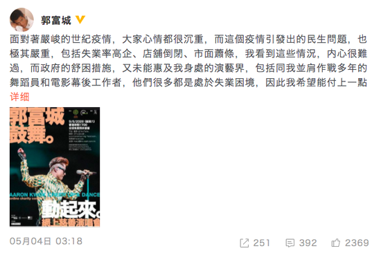 面對著嚴峻的世紀疫情,大家心情都很沉重,而這個疫情引發(fā)出的民生問題,也極其嚴重,包括失業(yè)率高企、店鋪倒閉、市面蕭條,我看到這些情況,內心很難過,而政府的舒困措施,又未能惠及我身處的演藝界,包括同我并肩作戰(zhàn)多年的舞蹈員和電影幕后工作者,他們很多都是處于失業(yè)困境,因此我希望能付上一點棉力,以我的慈善基金名義,舉辦一個網上慈善演唱會,為他們籌募一些抗疫舒困經費,以解燃眉之急!同時我也希望給大家一點鼓舞的訊息,發(fā)放正能量的表演,希望疫情早日過去,大家重回生活正軌。今次這個網上慈善演唱會將于5月9日下午5時全球網上直播,我會聯(lián)同我的舞蹈團隊傾力為大家表演一小時。為全人類打氣,為香港打氣!5月9日,大家一起鼓舞、動起來!寓看表演于行善,到時候網上見。