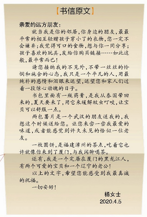 “這封信與那些禮物不同,如果說禮物是送給我們家的,那么這封信是寫給所有武漢人的。”張先生告訴記者,在那段黑暗的日子里,包括自己在內的許多武漢人經歷著煎熬,而遠在千里之外素未謀面的廈門賣家,以這樣的方式,鼓舞了他和他的家人。