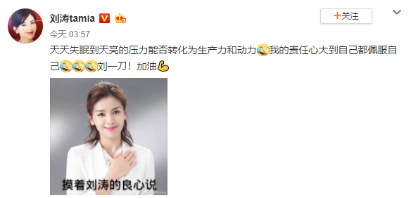 網易娛樂5月12日報道 5月12日凌晨,劉濤發文:“天天失眠到天亮的壓力能否轉化為生產力和動力,我的責任心大到自己都佩服自己。劉一刀!加油”。