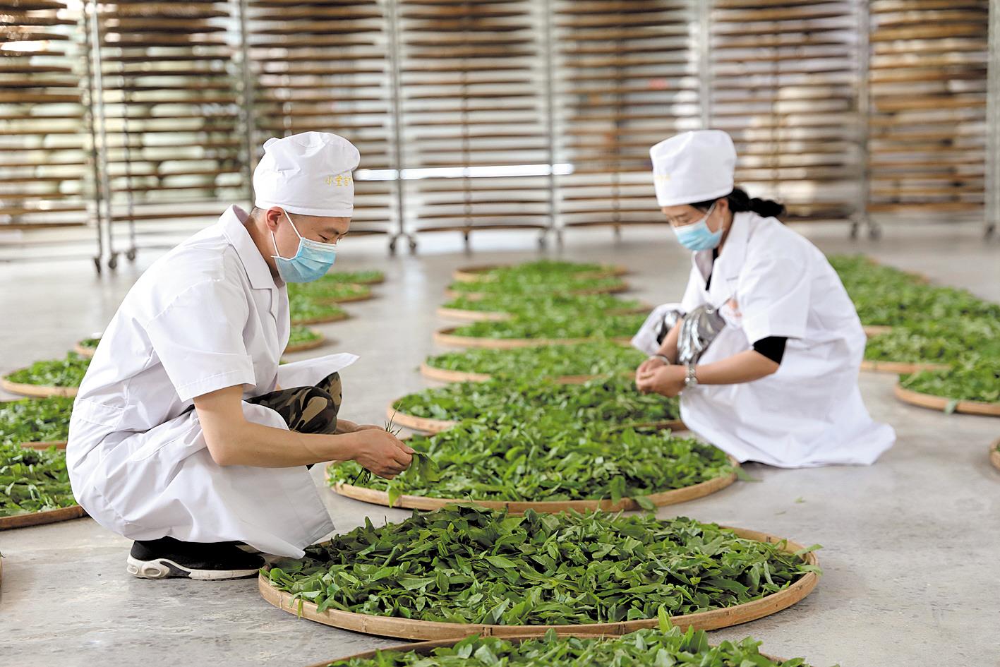 工人攤晾金錢柳鮮葉。