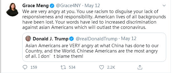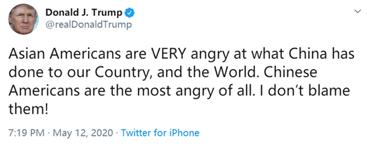 當地時間5月12日,特朗普發了這樣一條推文:“亞裔美國人對中國對我們國家和世界所做的一切感到非常憤怒。而華裔美國人是所有亞裔中最憤怒的。我不怪他們!”↓