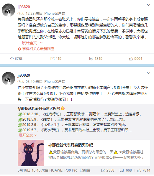 5月18日,面對黃景瑜粉絲的質疑,該網友再次連發數條內容為王雨馨發聲,她不僅曬出了王雨馨輕生前所發的遺言,還直接喊話黃景瑜,爆料稱黃景瑜在婚內出軌張藝上,并直接稱黃景瑜在親人去世時,讓王雨馨替自己守孝,而他本人則和張藝上在北京某酒店開房,離婚原因也是由于張藝上的挑釁和破壞。她表示黃景瑜還不幸被人染病,是王雨馨幫忙去開藥的。